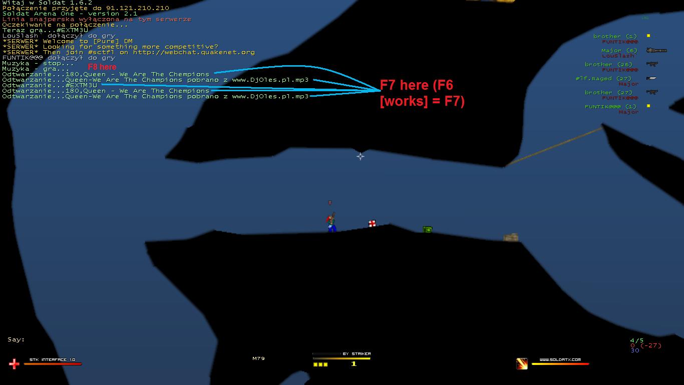 | Description | I created music playlist for Soldat in Mp3 folder. In Options in Soldat, i'm ticking this playlist. I'm joining the servre or running singleplayer game. I'm trying then to run music, but in console i see individual lines of music player, and music is not playing. | ||||||||||||