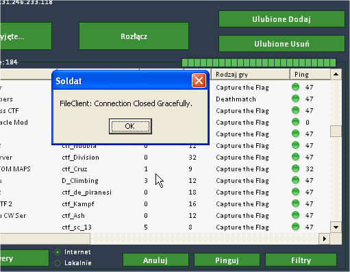 | Description | It happened when I was trying to join As de Espada's server. We wanted to test ctf_Cruz map together. I tried to join clicking server in lobby, but that bug stopped me! Couldn't join so we had to cancel tests. Next day everything was fine. Maybe ADE just configured server wrong. It might be something what's not even bug but I report it :) |