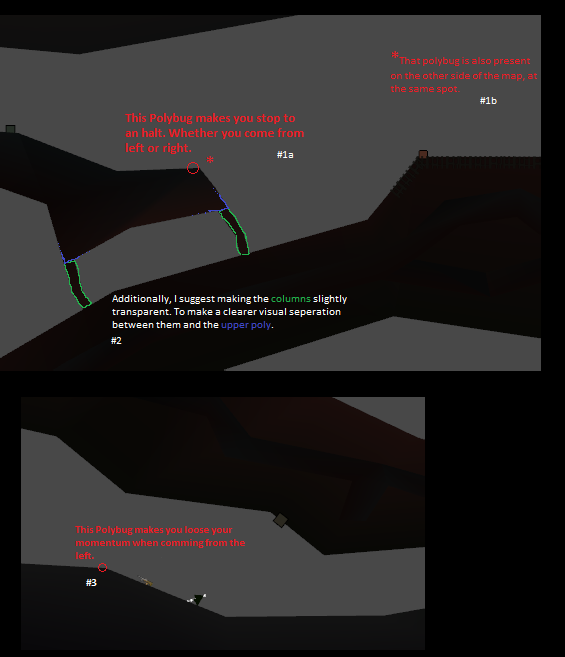 | Description | There are several polybugs in ctf_Division. See sreenshots below. 1a and 1b: These polybugs bring you to an halt. Whether you come from left or right. 2: Additionally, I suggest making the columns slightly transparent. To make a clear visual separation between them and the upper polys. 3: This polybug makes you loose your momentum when coming from the left. | ||||||||