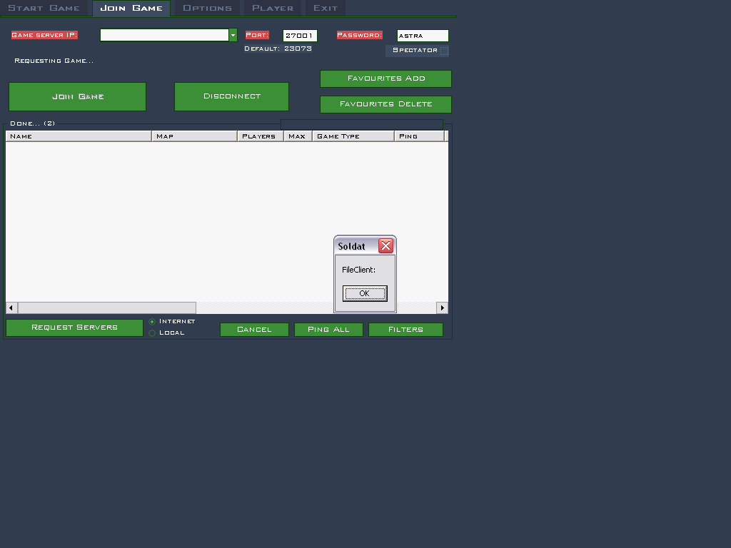 | Summary | 0000063: After getting banned out of a server, a tiny window opens up with "FileClient:" instead of the usual info about ban. | ||||||||||||