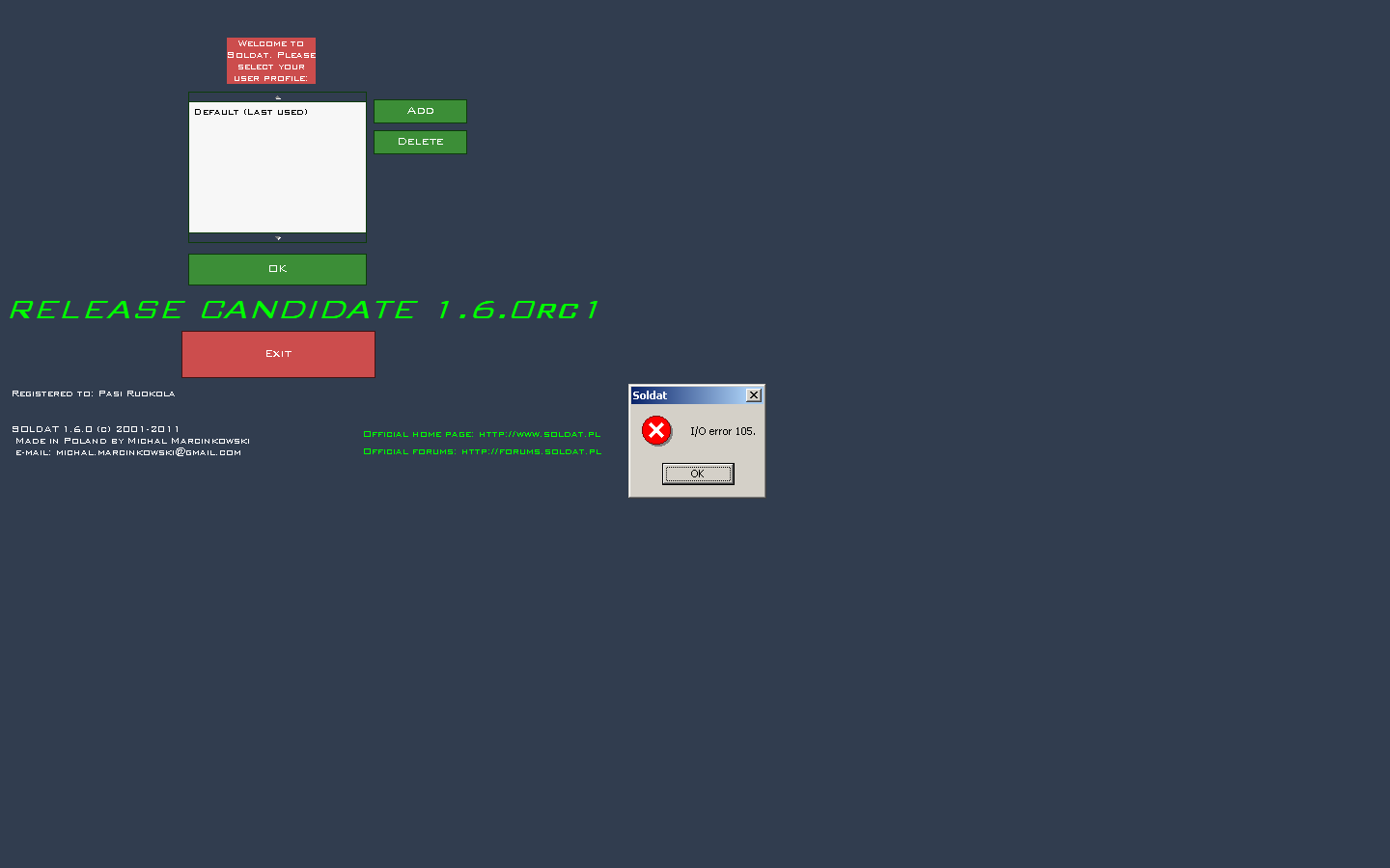 | Description | As reported on the forums, here: http://forums.soldat.pl/index.php?topic=40428.msg496303#msg496303 [^] and here: http://forums.soldat.pl/index.php?topic=41143.0 [^] When starting Soldat 1.6, the game shows an error message "I/O error 105", when the game is loaded (see the attachment). After the error message, the game continues to run, but several things are messed up / missing from the game: 1. The profiles select list doesn't show any previously created profiles. 2. Starting a new game is not possible, because both the map select and bot select lists are empty. 3. Joining a server is possible, but the teams select and weapon select menus are missing their text. | ||||||||